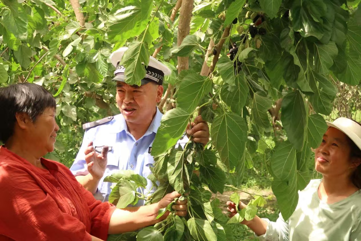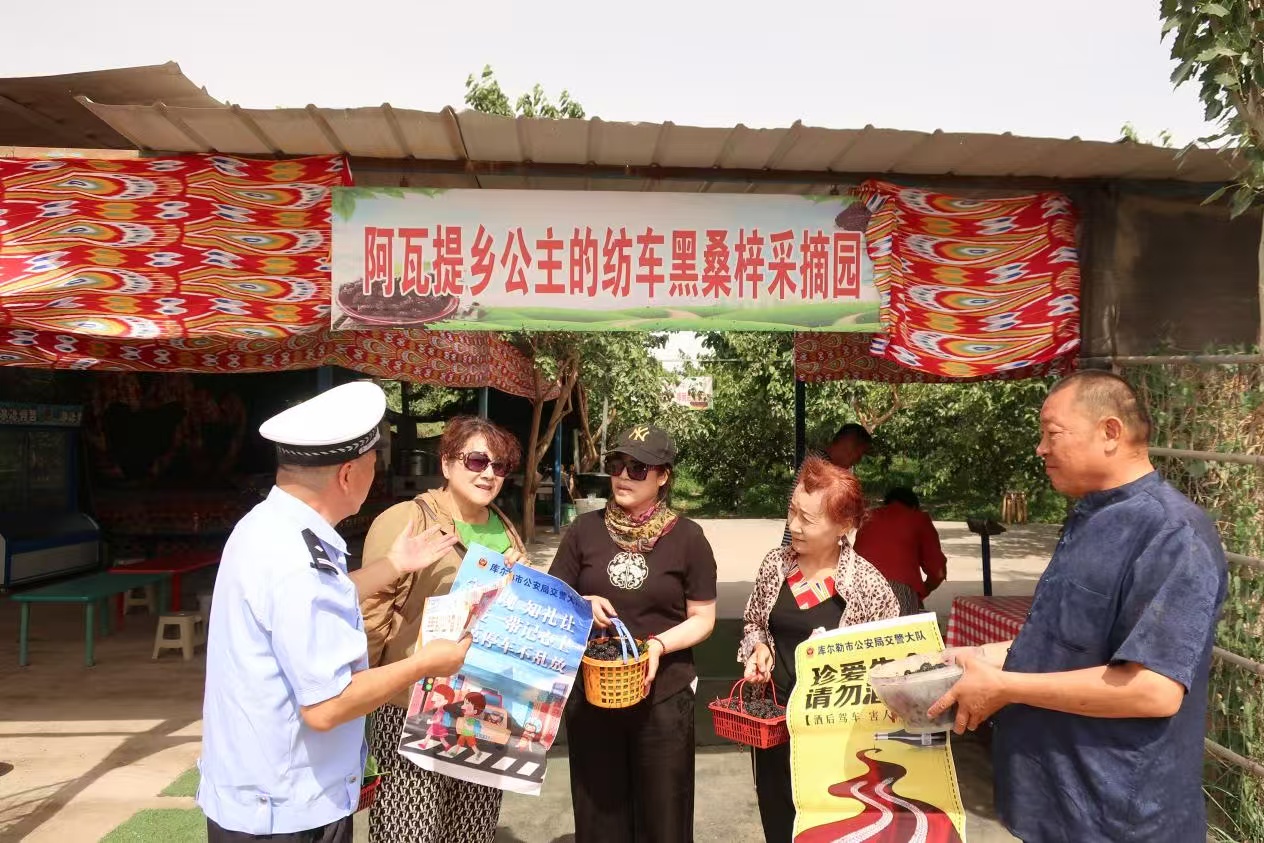 又是一年好“豐”景,鄉(xiāng)村振興入“畫”來;桑果飄香“警”相隨,巡回宣講“話”安全。6月3日,新疆庫爾勒市公安局交警大隊民警深入到庫爾勒市阿瓦提鄉(xiāng)公主的紡車黑桑葚采摘園開展“美麗鄉(xiāng)村行”交通安全巡回宣講,為慕名前來采摘成熟飽滿的黑桑葚、藥桑葚市民和游客普法送安全。