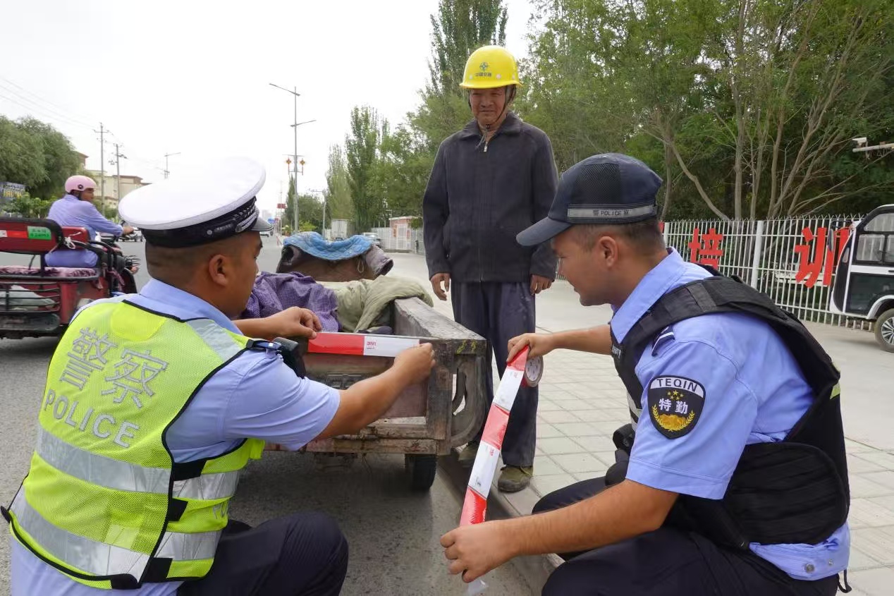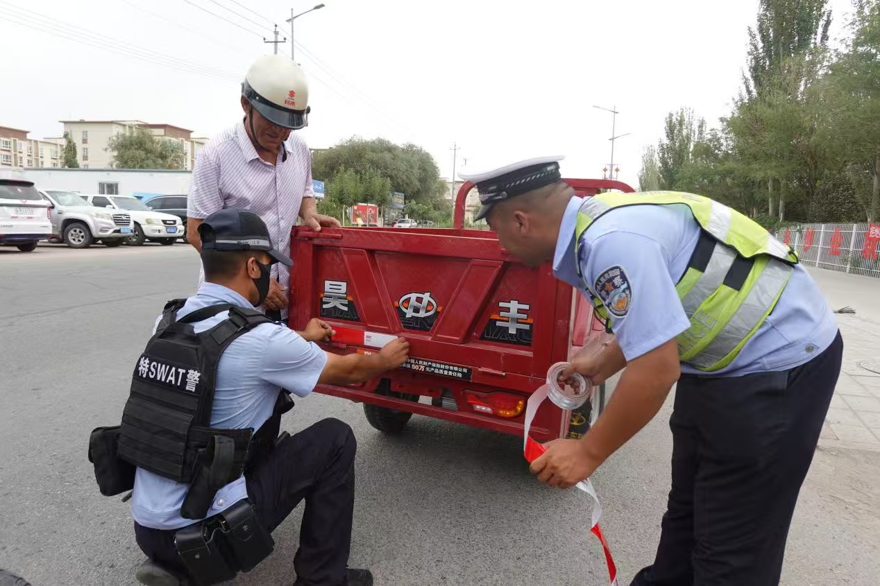 7月31日下午,新疆庫爾勒市公安局交警大隊蘭干路中隊與蘭干路派出所“交所聯(lián)動”再次組織民警輔警有針對性地查處騎乘電動車、摩托車者不按規(guī)定戴安全頭盔、面包車超員等交通違法行為,向農(nóng)村群眾開展“知危險會避險、安全文明出行”主題教育,并免費為各類車輛粘貼反光貼,力爭用實際行動筑牢農(nóng)村道路交通安全網(wǎng)。