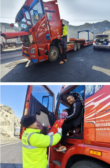 2月2日清晨8時(shí)30分許,一輛從新疆維吾爾自治區(qū)阿克蘇往烏魯木齊運(yùn)輸32噸瀝青的新P19798中型半掛車在G216線1186+200處的塔什店山區(qū)道路上擋位失靈,只能掛高擋位,無法掛一至二擋,這下可急壞了駕駛?cè)税壬。正?dāng)他將中型半掛車停在道路旁,焦急地四處求助無果時(shí),庫爾勒市公安局塔什店中隊(duì)的領(lǐng)導(dǎo)執(zhí)勤交警駕駛警車巡邏時(shí)發(fā)現(xiàn)這一警情,及時(shí)用警車開道,引領(lǐng)中型半掛車安全駛到塔什店山區(qū)臨時(shí)停車區(qū),并從塔什店鎮(zhèn)請來大車修理師傅,經(jīng)過兩個(gè)小時(shí)的不懈努力,終于修好了車,執(zhí)勤交警還給駕駛?cè)税壬蜕涎b有“平安福”袋的交通安全大禮包,護(hù)送艾先生駕駛中型半掛車駛向目的地。