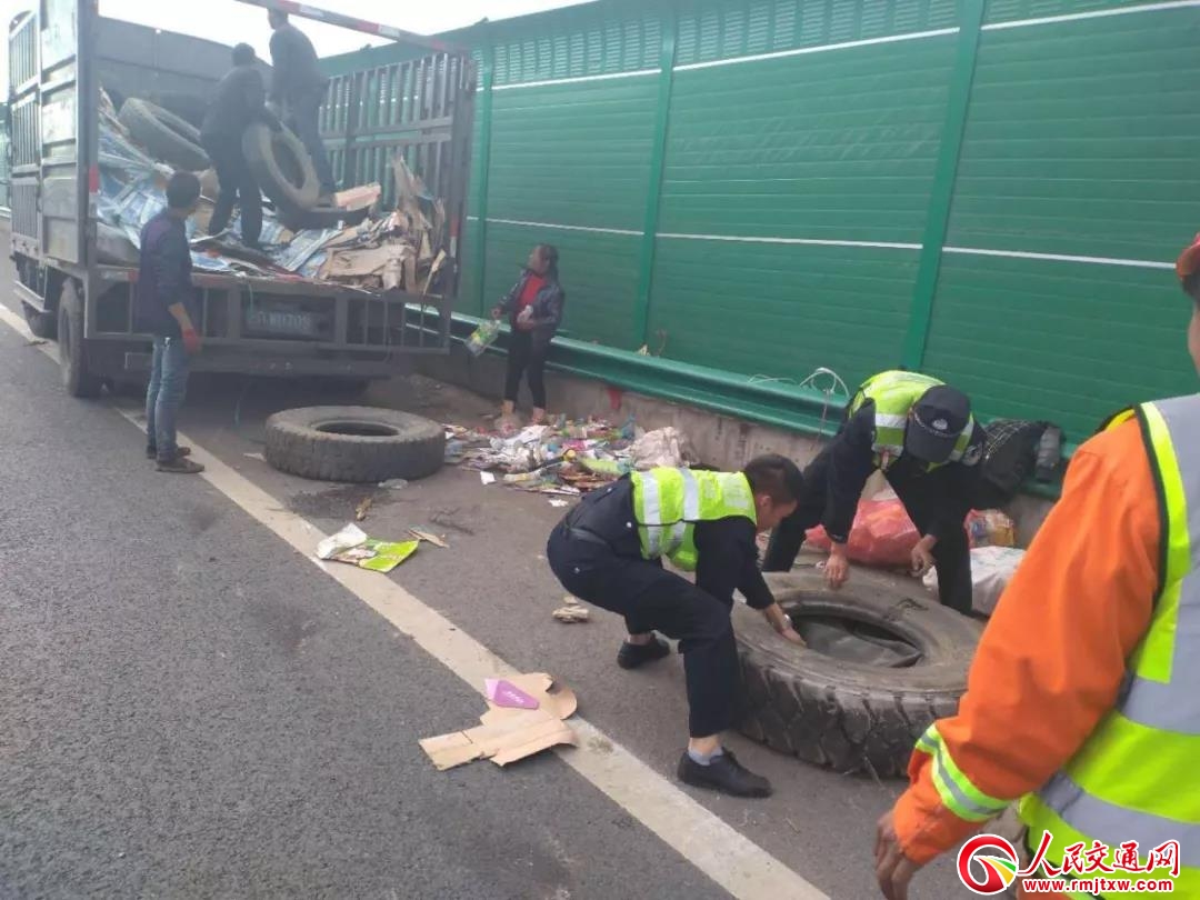 為了防止二次事故發(fā)生,民警便立即投入現(xiàn)場救援:一邊安排人員在肇事現(xiàn)場后方設立警示標志,并安排專人指揮現(xiàn)場通行車輛減速慢行,做好現(xiàn)場安全防護工作;另一邊設立事故警戒區(qū)域,快速勘查事故現(xiàn)場,完成事故認定工作;同時,指揮施救車輛對事故車輛進行快速救援,并聯(lián)合現(xiàn)場高速公路養(yǎng)護人員徒手將側(cè)翻車輛上的貨物搬移至另一輛施救貨車。