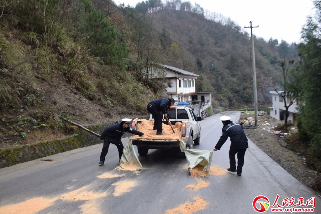 當(dāng)日上午,縣公安局黨委委員、交警大隊(duì)長(zhǎng)涂松同志帶領(lǐng)民警前往石朝鄉(xiāng)檢查抗雪保暢工作時(shí),在303省道沙壩路段發(fā)現(xiàn)近1公里的路面被菜油污染,導(dǎo)致多車發(fā)生事故,所幸未造成人員傷亡。為及時(shí)消除油污形成的公路安全隱患,涂松大隊(duì)長(zhǎng)立即組織警力對(duì)該路段實(shí)施交通管制,并安排辦公室人員與公路管理所聯(lián)系,但公路管理所要從近30公里外的鎮(zhèn)南鎮(zhèn)調(diào)人處理。由于該路段車輛流量較大,滯留車輛不斷增加。為及時(shí)消除隱患,恢復(fù)交通,確保滯留車輛通行,涂松大隊(duì)長(zhǎng)一邊指揮現(xiàn)場(chǎng)民警、輔警采取鏟沙鋪路措施,并調(diào)集城區(qū)警力及時(shí)運(yùn)載木屑到油污路段除油。木屑未到之前,涂松大隊(duì)長(zhǎng)帶領(lǐng)現(xiàn)場(chǎng)民警、輔警像公路養(yǎng)護(hù)工人一樣,你一鏟、我一鏟,將路旁的巖石風(fēng)化沙鏟到被污染的路面。20分鐘后,木屑運(yùn)到現(xiàn)場(chǎng)后,涂松大隊(duì)長(zhǎng)指揮運(yùn)載木屑的車輛沿油污路段緩慢行駛,民警在車上沿途撒著木屑,隨后民警、輔警將沿途撒下的木屑均勻地掃在油污路段。30分之后,金黃色的木屑鋪滿了整個(gè)油污路段,就好像一條金光大道在迎接著被滯留的車輛。