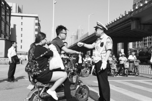 友誼大街與槐安路交叉口,交警攔停違法非機動車。 記者 胡雁冰 攝