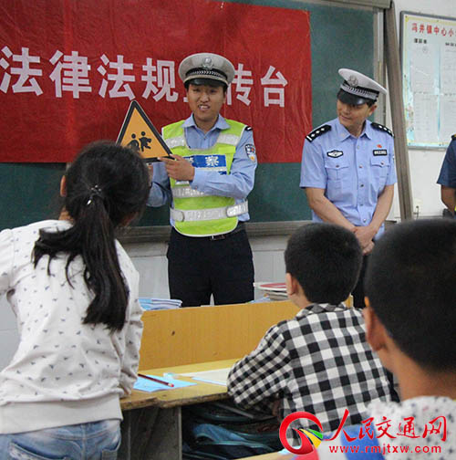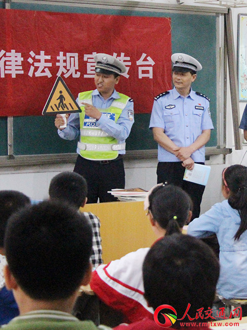 民警在教孩子們識(shí)別交通標(biāo)志牌