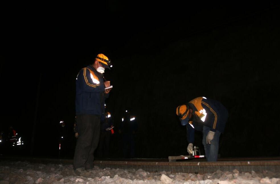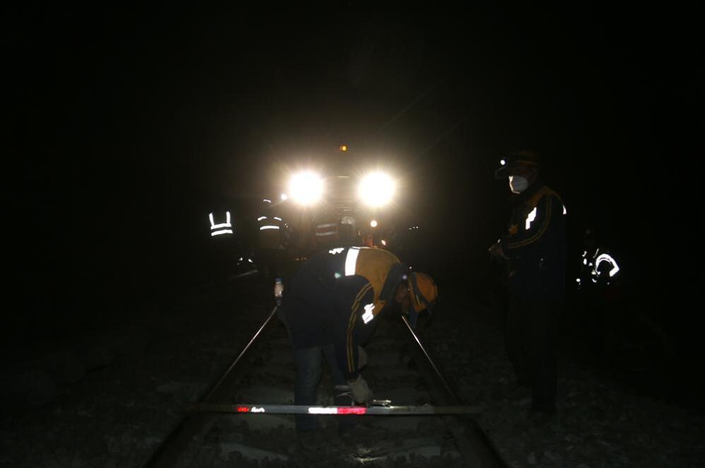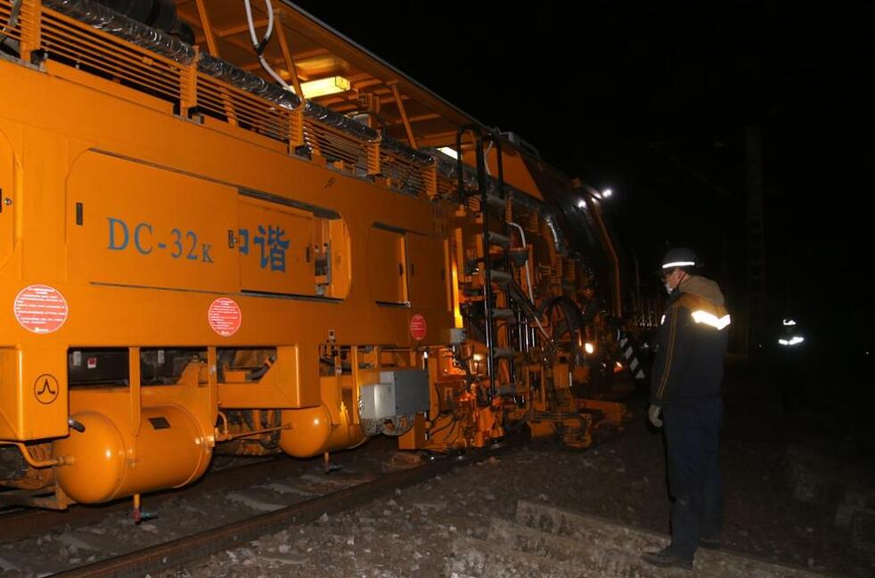 5月3日23時45分,在蘭新鐵路馬家坪至龍泉寺下行區(qū)間線路上,機具轟鳴、人聲鼎沸,照明燈具照亮整個施工現(xiàn)場。蘭州鐵路局蘭州西工務(wù)段和蘭州工務(wù)機械段100余人、3臺大型機械正在開展線路大機維修施工作業(yè),確保鐵路運輸安全,做好鐵路軌道高溫防脹工作。