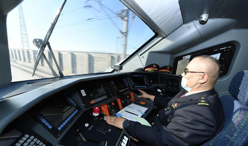 10月11日,首發(fā)動車的列車司機(jī)阿地·吐爾地在駕駛室內(nèi)。 當(dāng)日,新疆烏魯木齊至陜西西安方向首趟直達(dá)動車開行,全程2354公里,運行時間13小時22分。據(jù)介紹,這是蘭新高鐵運營6年來開行的第二趟出疆方向動車組列車,烏魯木齊至西安實現(xiàn)了朝發(fā)夕至。