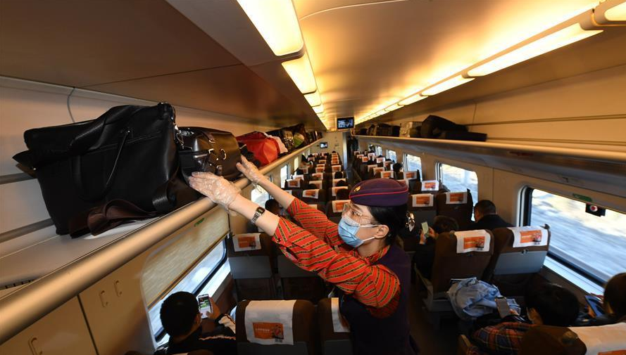 10月11日,列車員在烏魯木齊至西安北D2708次動車組列車上整理行李架。 當(dāng)日,新疆烏魯木齊至陜西西安方向首趟直達(dá)動車開行,全程2354公里,運行時間13小時22分。據(jù)介紹,這是蘭新高鐵運營6年來開行的第二趟出疆方向動車組列車,烏魯木齊至西安實現(xiàn)了朝發(fā)夕至。