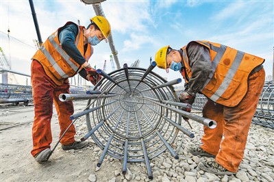 北京城市副中心站綜合交通樞紐工程建成后,京唐城際、京濱城際等將在這里交會。圖為2月19日,工人正在北京城市副中心站綜合交通樞紐施工現(xiàn)場忙碌。(孫立君/攝)
