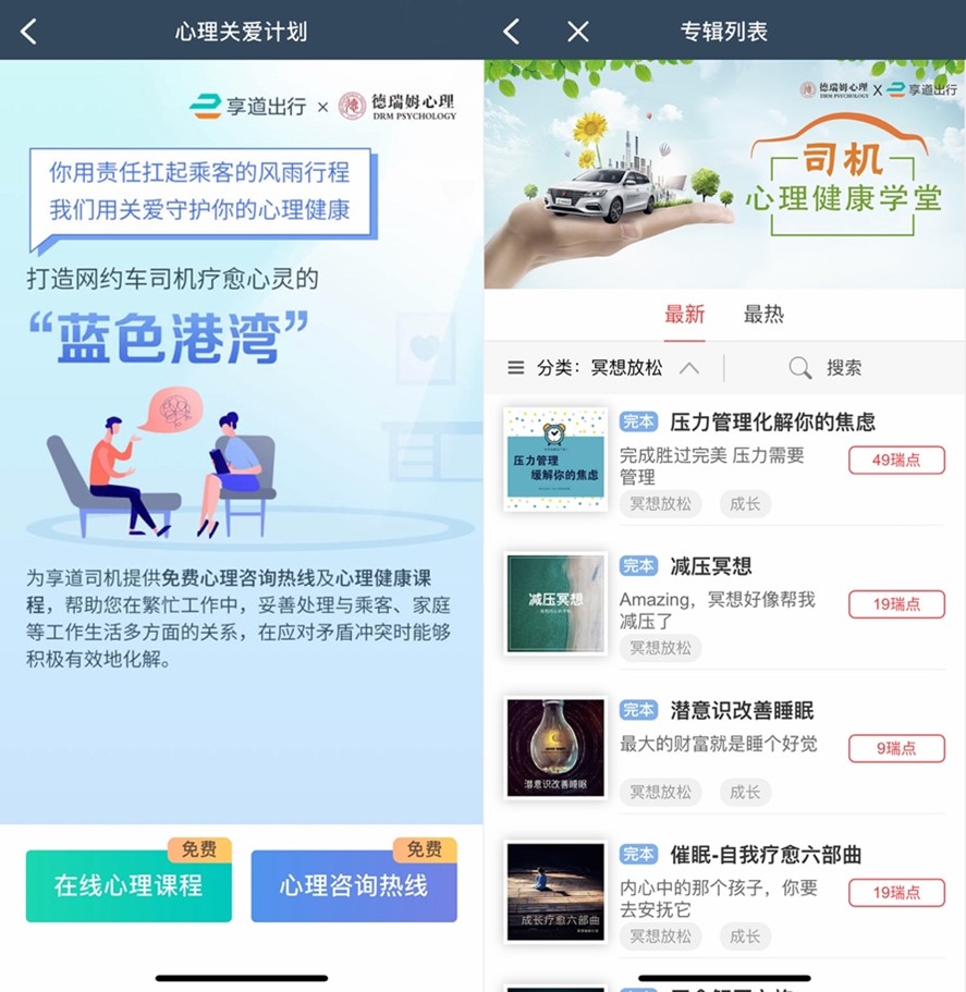 公益講座后續(xù)將在杭州、寧波、蘇州、南京、合肥、鄭州等地陸續(xù)舉辦,惠及更多司機(jī)。此外,為方便司機(jī)日常學(xué)習(xí),依托德瑞姆專業(yè)心理培訓(xùn)的音視頻課件,“心理健康關(guān)愛計(jì)劃”悉心定制享道司機(jī)專屬心理課程,現(xiàn)已上線享道司機(jī)端APP,司機(jī)可以利用碎片化時(shí)間免費(fèi)學(xué)習(xí)。