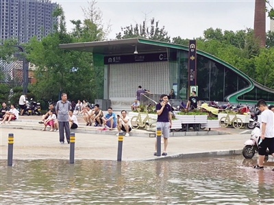 7月21日下午,鄭州沙口路地鐵站門前仍有積水。新京報(bào)記者 楊雪 攝