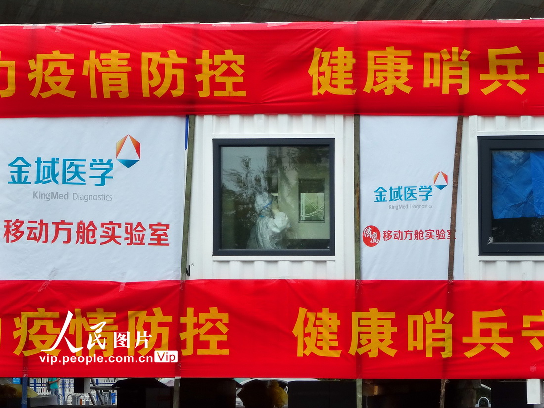 日前,為方便當(dāng)日離寧旅客,有關(guān)單位在南京站、南京南站、徐莊和江北新區(qū)四處設(shè)立疫情防控移動(dòng)方艙實(shí)驗(yàn)室,現(xiàn)場(chǎng)采樣檢測(cè),現(xiàn)場(chǎng)出具核酸檢測(cè)報(bào)告。王路憲攝(人民圖片網(wǎng))