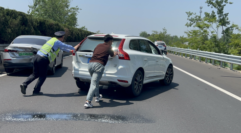 5月4日10時(shí)許,江蘇省交通綜合執(zhí)法局連徐支隊(duì)第三大隊(duì)執(zhí)法人員王德永、陳卿駕車巡邏至G30連霍高速邵樓服務(wù)區(qū)附近時(shí),突然發(fā)現(xiàn)前方車輛紛紛急剎車,向兩側(cè)車道避讓,交通執(zhí)法人員意識(shí)到前方可能有突發(fā)情況,迅速上前查看。原來兩輛轎車停在高速公路中間行車道內(nèi),旁邊車輛疾馳而過,十分危險(xiǎn)。因五一假期正值返程高峰,該路段通行車輛仍然較多,為避免造成二次事故,交通執(zhí)法人員將現(xiàn)場(chǎng)情況及時(shí)告知調(diào)度中心,同時(shí),執(zhí)法車輛鳴響警笛,警示車輛提前減速避讓,將事故車輛推至緊急?繋。