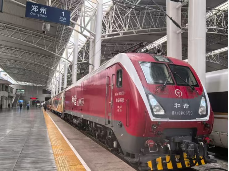早上 7 點多鐘,我們一起乘車來到擁有百年歷史的鄭州車站。工作人員引導我們登上站臺,一列涂裝富有時代色彩的新型旅游列車展現(xiàn)在我們眼前,運行前方連掛著一臺新型的 “和諧號” 客運電力機車,整裝待發(fā)。