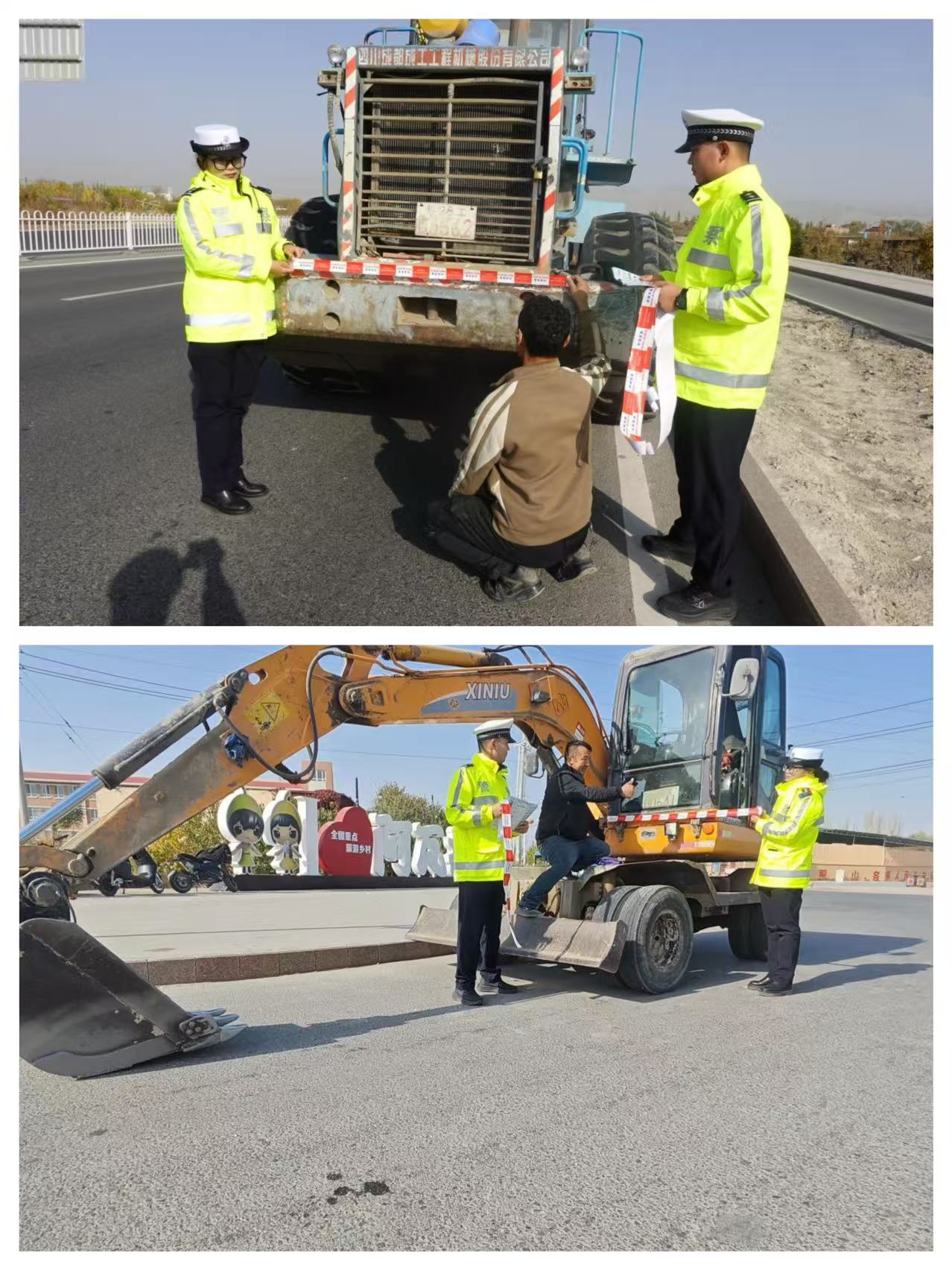 連日來,為了搶抓時機,全面夯實農(nóng)業(yè)生產(chǎn)發(fā)展基礎,許多挖掘機、推土機等工程車輛出行頻繁,農(nóng)村道路安全隱患也隨之增加。為切實防范化解道路交通安全風險,全力減少工程車輛交通違法、預防農(nóng)村道路交通事故,庫爾勒市公安局交通管理大隊民警輔警除認真檢查駕駛?cè)俗C照外,還對工程車輛尾燈、剎車燈和反光貼落實情況逐個檢查,民警輔警不厭其煩地向駕駛?cè)酥v解“亮尾”“亮燈”行動和遵守交通法規(guī)、安全文明駕駛的重要性,幫助駕駛?cè)饲謇砉こ誊囕v污垢,免費粘貼反光標識,確保庫爾勒轄區(qū)農(nóng)村道路交通形勢持續(xù)平穩(wěn)。(嚴萬海)