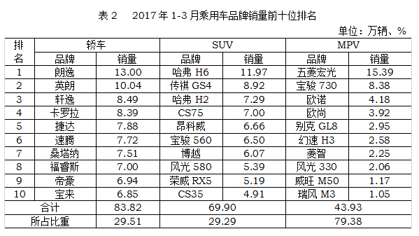 1-3月,乘用車共銷售594.76萬輛,同比增長4.63%,增速比上年同期減緩2.12個百分點。其中:基本型乘用車(轎車)銷售283.95萬輛,同比增長0.59%;運動型多用途乘用車(SUV)銷售238.61萬輛,同比增長20.91%;多功能乘用車(MPV)銷售55.34萬輛,同比下降17.40%;交叉型乘用車銷售16.86萬輛,同比下降22.74%。