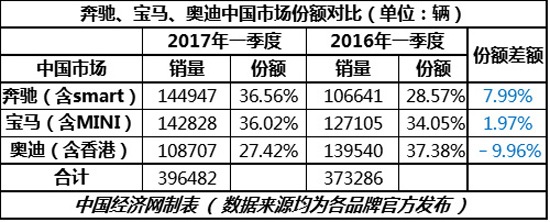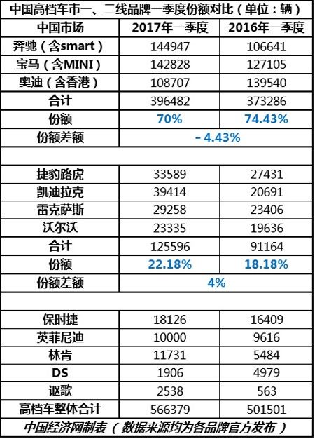 那么,經(jīng)歷了一番動蕩與洗牌之后,到底是誰搶了昔日龍頭老大——奧迪的市場份額?如今國內(nèi)高檔車市場格局到底是怎樣的?通過對比2017年及2016年一季度銷量數(shù)據(jù),中國經(jīng)濟網(wǎng)汽車頻道為您呈現(xiàn)這一市場的真相。