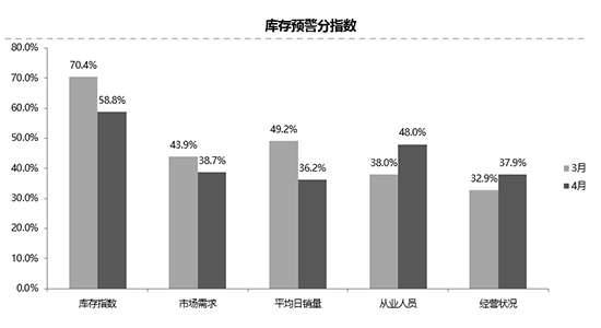 從預(yù)警分指數(shù)來看,4月份庫(kù)存指數(shù)、市場(chǎng)需求指數(shù)、平均日銷量指數(shù)環(huán)比下降;從業(yè)人員指數(shù)、經(jīng)營(yíng)狀況指數(shù)環(huán)比上升。郎學(xué)紅分析道,4月份銷量收縮,導(dǎo)致庫(kù)存水平略有上漲,所以4月份經(jīng)銷商庫(kù)存系數(shù)應(yīng)該還是在警戒線之上,甚至?xí)?月份還高。