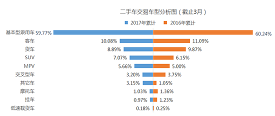 分車型來看,一季度二手車交易中轎車仍為主要流通車型,占比達(dá)到59.77%,其次為客車占比10.08%,貨車占比8.89%,SUV占比7.07% ,MPV占比5.66%。相比2016年, MPV、SUV占比均有所增加。