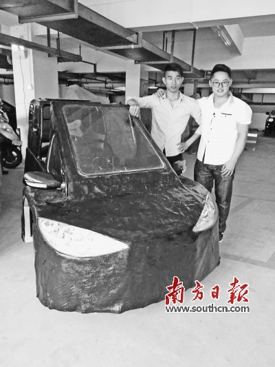 李四鵬、嚴小兵與他們自制的三輪電動汽車。南方日報記者 高薇 攝