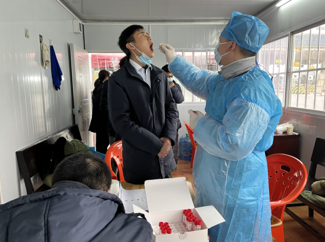 全面篩查員工健康狀況。在檢測(cè)場(chǎng)地,南平鎮(zhèn)衛(wèi)生院醫(yī)護(hù)人員做好防護(hù)措施后,對(duì)場(chǎng)地進(jìn)行消殺,再逐一對(duì)隊(duì)員們進(jìn)行測(cè)溫,體溫正常后,對(duì)管理所員工經(jīng)過(guò)人員信息核對(duì)、并取樣咽拭子進(jìn)行核酸檢測(cè)。