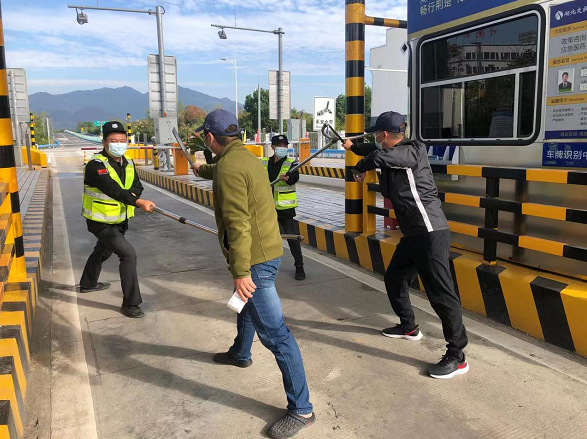 當日上午10時30分,演練開始。兩名戴著口罩的歹徒突然闖入收費崗亭,手持兇器恐嚇并意圖搶劫收費錢款,對收費員工人身安全和票款造成嚴重威脅。面對歹徒的叫囂與兇惡,當班工作人員一邊冷靜機智與之周旋,一邊摁下亭內(nèi)報警按鈕。監(jiān)控室接到突發(fā)報警,一方面調(diào)整監(jiān)控鏡頭鎖定收費現(xiàn)場,另一方面立馬報告當班值班領導,并及時報警110。在當班值班領導的指令下,第一時間啟動應急預案,迅速集合所內(nèi)安保人員攜帶防暴器械趕往現(xiàn)場緊急支援,同時積極疏導車輛分流其它車道,防止歹徒對司乘人員造成人身傷害。最后,在收費站安保人員與其它工作人員的勇敢合圍之下,兩名窮兇極惡的歹徒被大家徹底制服,在收費站上演的驚險一幕至此也畫上了圓滿的句號。
