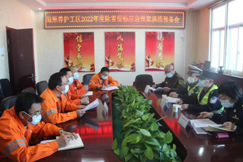 此次演練打破了以往的固定模式,增加常態(tài)化疫情防控下除雪準備工作,更加凸現(xiàn)演練的實戰(zhàn)化。演練模擬分公司轄段根據(jù)氣象顯示未來三天出現(xiàn)降雪天氣,分公司陽原工區(qū)作為召集方,召集聯(lián)動單位陽原收費站、高速交警、高速路政召開“戰(zhàn)前”碰頭會,碰頭會對雪情進行預(yù)測,制定詳細除雪方案。演練模擬常態(tài)化疫情防控下為保障除雪工作順利進行,防止出現(xiàn)因疫情封控導(dǎo)致機手、人員不足的情況,工區(qū)除雪機械設(shè)備組、現(xiàn)場調(diào)度組、后勤保障組提前三天全部集中工區(qū)閉環(huán)管理,全面啟動固體融雪劑拆裝、液體融雪劑攪拌工作,為見雪上路做好準備。