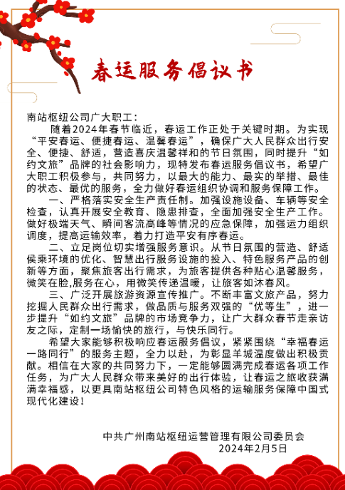 春節(jié)臨近,年味漸濃。在越發(fā)臨近春節(jié)的春運關(guān)鍵時期,為做好春運服務(wù)保障工作,南站樞紐公司黨委向廣大職工發(fā)布了春運服務(wù)倡議書,引導(dǎo)公司全體職工以最大能力、最佳狀態(tài)、最高標(biāo)準(zhǔn)做好春運組織協(xié)調(diào)和服務(wù)保障工作。