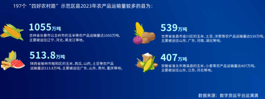 運滿滿大數(shù)據(jù)顯示,197個“四好農(nóng)村路”全國示范縣均涉及到農(nóng)產(chǎn)品的運輸,2023年度有44個縣農(nóng)產(chǎn)品運輸量超過百萬噸。