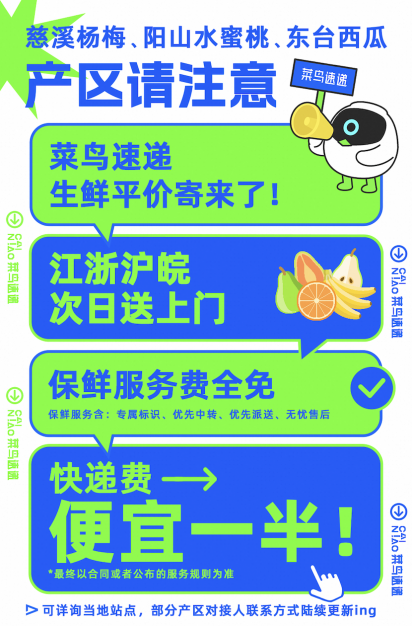 公開信息顯示,今年以來,面向生鮮市場,菜鳥速遞推出“生鮮平價寄”服務,主打48小時內(nèi)送貨上門、價格減半,做極致性價比。早前已經(jīng)覆蓋杭州西湖龍井、塘棲枇杷以及洛陽新安櫻桃等水果主產(chǎn)區(qū)。