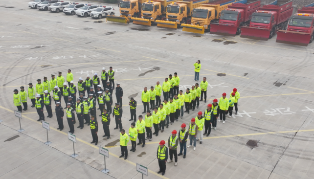 在除雪防滑實戰(zhàn)環(huán)節(jié),演練現場井然有序。融雪劑撒布車率先開路,多臺推雪車組成作業(yè)梯隊,依次對車道進行清雪。機械作業(yè)過后,養(yǎng)護人員隨即對機械難以覆蓋的邊角區(qū)域進行人工補撒防滑沙,力求實現除雪防滑的全覆蓋。