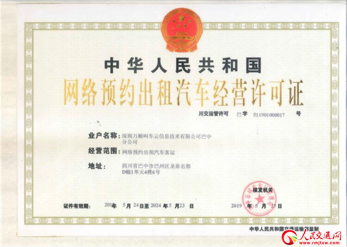 人民交通訊 2019年5月28日,記者從四川省巴中市交通運(yùn)管部門獲悉,萬順叫車獲巴中市交通運(yùn)輸局頒發(fā)的《網(wǎng)絡(luò)預(yù)約出租汽車經(jīng)營(yíng)許可證》。