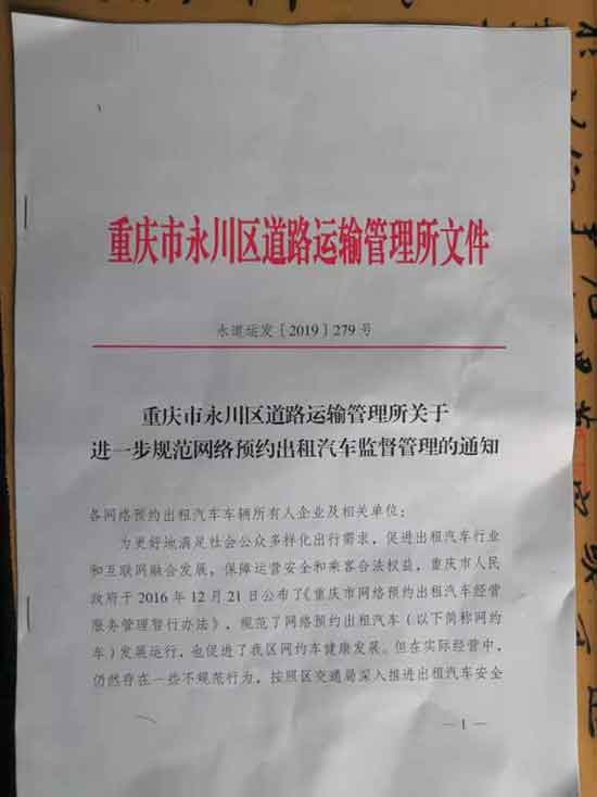 2019年8月6日,重慶永川道路管理局發(fā)布《重慶市永川區(qū)道路運(yùn)輸管理所文件》,為保障市民乘車安全,永川道路管理局同相關(guān)部門開展專項(xiàng)行動(dòng),將嚴(yán)格整治網(wǎng)約車行業(yè)違法亂紀(jì)現(xiàn)象,全面清退不合規(guī)不合法的網(wǎng)約車平臺(tái),進(jìn)一步規(guī)范網(wǎng)絡(luò)預(yù)約出租汽車的合法運(yùn)營(yíng)。