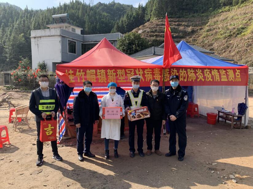 在做好分局防控工作的同時(shí),身為六社村“大村長(zhǎng)”的鐘小洪還時(shí)刻牽掛著村里的防控情況。他統(tǒng)籌兼顧,輾轉(zhuǎn)國(guó)省干線之余常常深入扶貧村這另外的“戰(zhàn)場(chǎng)”,布置督導(dǎo)各項(xiàng)防控工作,為村里執(zhí)勤人員送去口罩等防護(hù)用品,囑咐村民做好自我防護(hù),督促村兩委加大宣傳引導(dǎo)力度,發(fā)動(dòng)黨員、小組長(zhǎng)、村醫(yī)、群眾志愿者一起開(kāi)展疫情防控工作,確保人民群眾的生命健康安全。他說(shuō):“現(xiàn)在不同以往,只有我們干部站在一線,讓村民常?吹轿覀兊纳碛埃迕裥睦锊拍芊畔率^。”