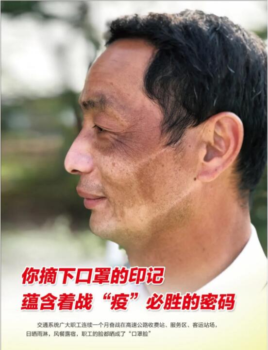 3月3日,他登上《人民日?qǐng)?bào)》公益廣告,一個(gè)人就占據(jù)了一個(gè)整版。而他背后挺立的,是整個(gè)廣東交通人隊(duì)伍。在這一個(gè)月里,寒潮夾風(fēng)雨,陽(yáng)光帶高溫,他們臉上留下了深深淺淺的印記。“口罩臉”,是戰(zhàn)“疫”留給他們的最美印記。