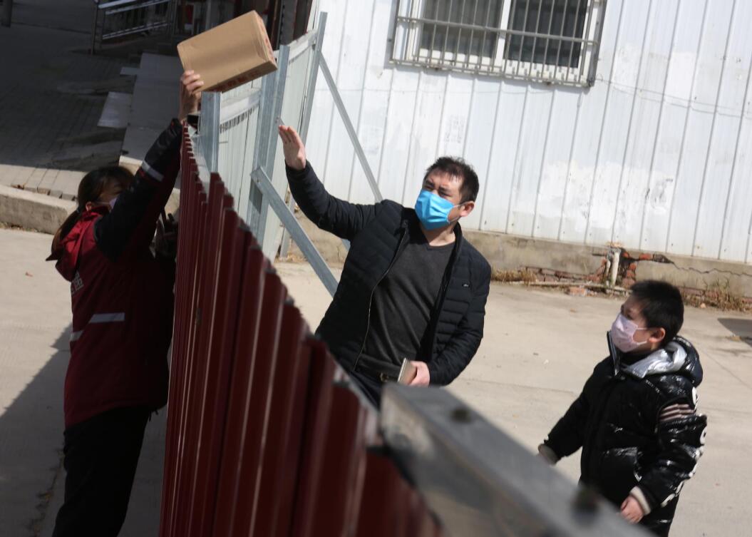 2020年3月16日,在河南省淮濱縣濱湖街道眾成街道封閉的鐵皮護(hù)欄前,只見一名身著深紅色制服的快遞小姐姐在鐵皮護(hù)欄前,不時(shí)地一個(gè)接著一個(gè)地打電話。很快,又見她將快遞件一次次的高高舉過頭頂,穩(wěn)穩(wěn)的遞交到鐵皮護(hù)欄內(nèi)因疫情宅在巷子里的居民手中。整個(gè)投遞過程,快遞小姐姐的動(dòng)作是那樣的嫻熟,身影是那樣的美麗。