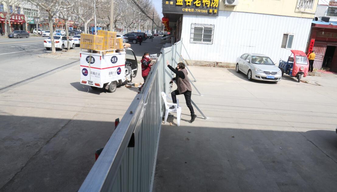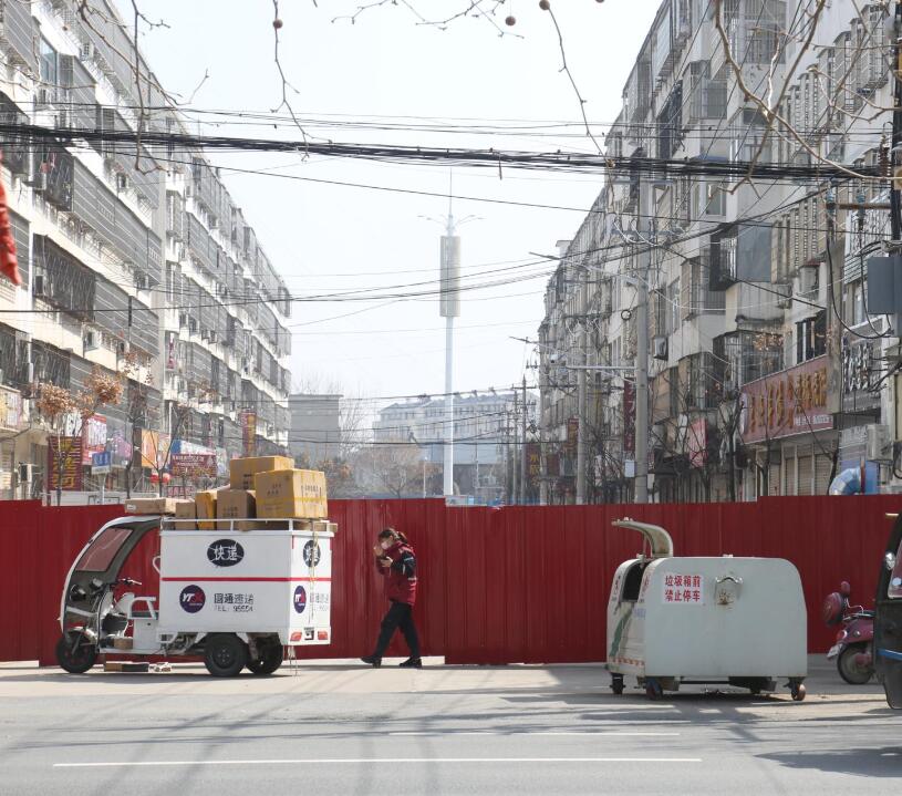 圖為3月16日,快遞小姐姐在鐵皮護(hù)欄前投送快遞時(shí)的情形。
