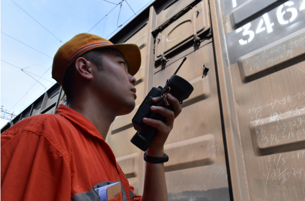 檢車員魏梓健用對(duì)講機(jī)和值班員核對(duì)車輛修程。