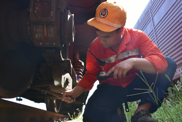 檢車員魏梓健檢查車輛車鉤部位技術(shù)狀態(tài)。