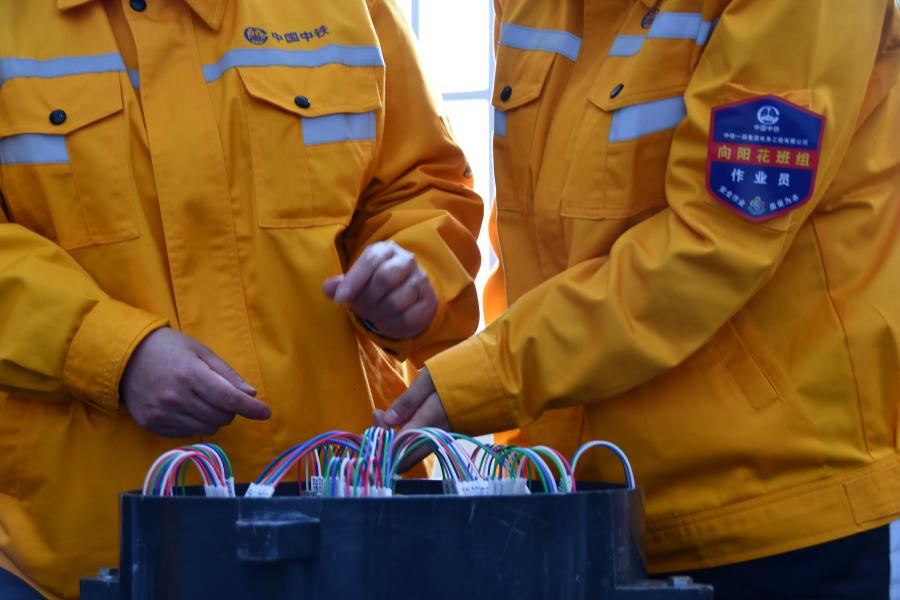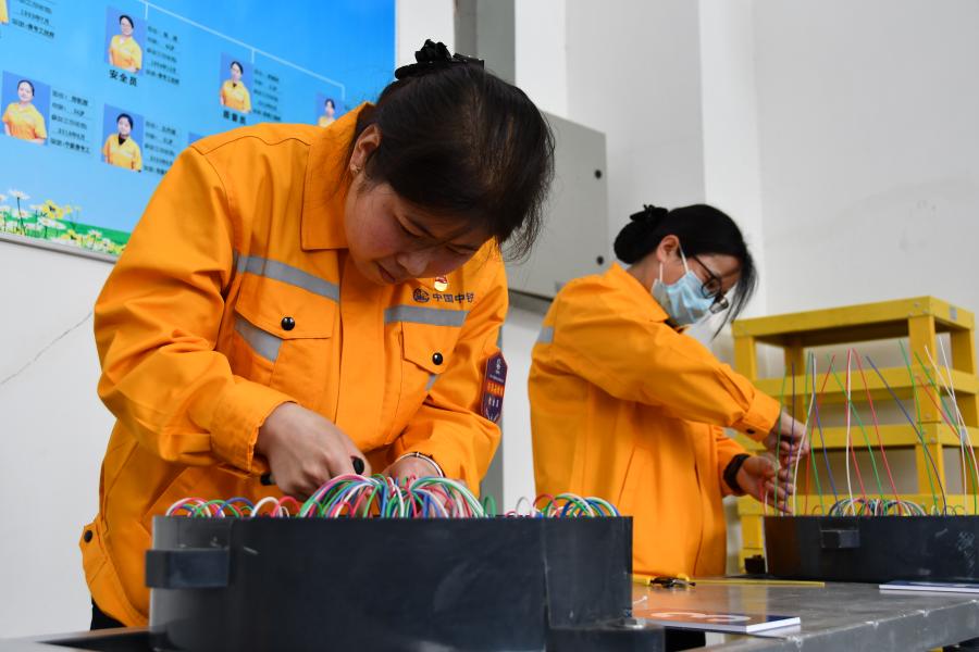 邵宏琴(右)為組員講解機(jī)柜配線要領(lǐng)。新華社記者 張斌 攝