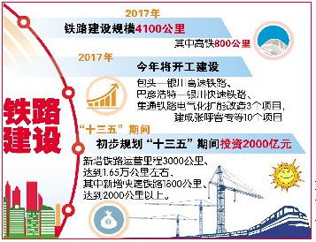 2017年,我區(qū)將全面加快建設(shè)橫跨東西、縱貫?zāi)媳、快速連接、通江達(dá)海的高速鐵路網(wǎng),分享高鐵經(jīng)濟(jì)帶來的更多紅利。鐵路建設(shè)規(guī)模4100公里,其中高鐵800公里。今年春季,我區(qū)將集中開工的項(xiàng)目中,鐵路網(wǎng)項(xiàng)目7個(gè)。