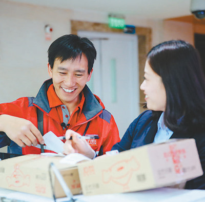京東配送員宋學(xué)文(左)與客戶熱情交流。資料圖片