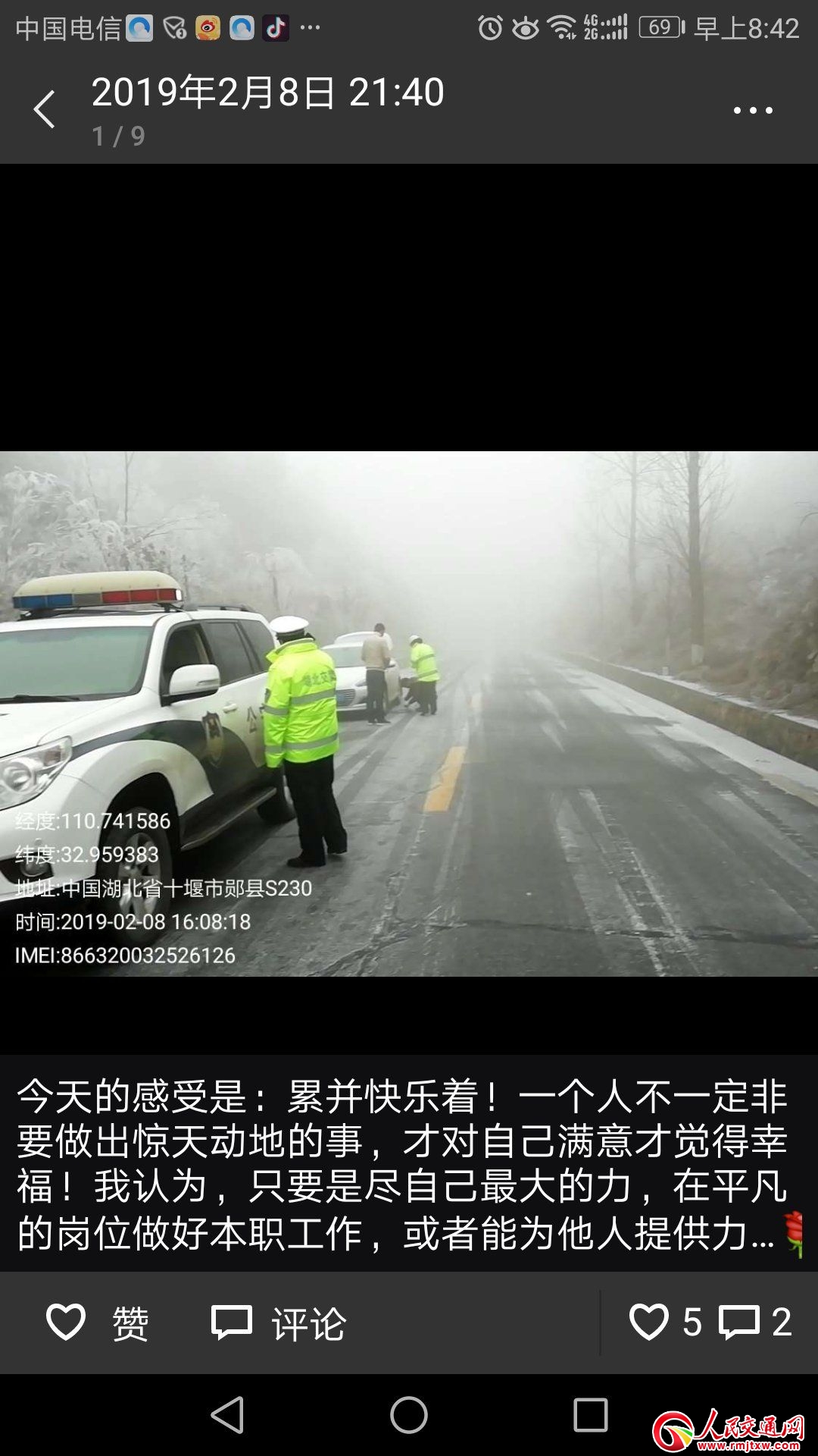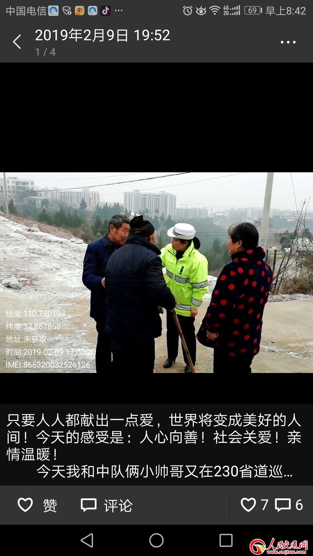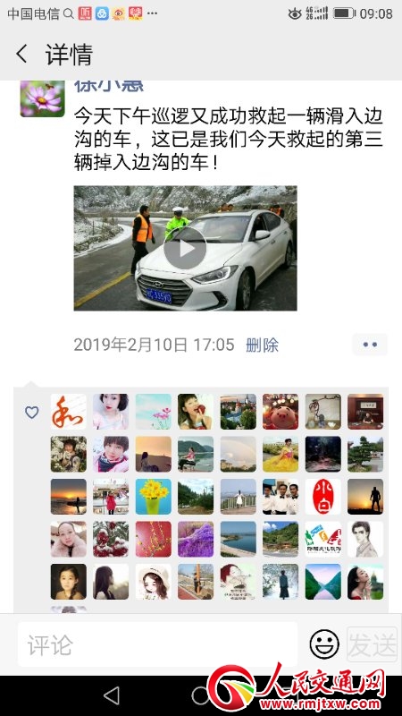 2月10日,她在朋友圈中寫到:人多力量大!發(fā)揚愚公精神!上午,230省道巡邏途中,遇多輛外地從高速公路下來經(jīng)230省道的外地車輛因道路結冰停到路中無法移動,還有一起從城區(qū)去大柳接病人進城看病的皮卡車掉入邊溝,因路滑聯(lián)系施救車輛不敢上來,還有急拐彎處兩車輕微事故……
