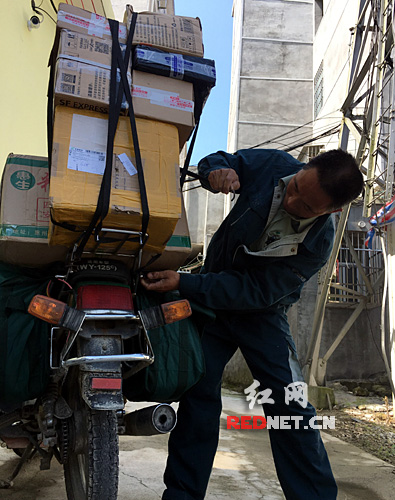將報(bào)紙信件和村民們購買的眾多包裹一起,捆綁在跟隨他多年的那輛舊摩托車上。在仔細(xì)檢查核對、確認(rèn)無誤后,徐永輝開始了一天的行郵。