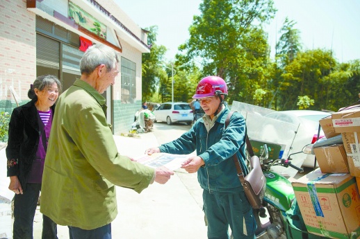 5月9日,岳陽縣月田鎮(zhèn)花苗村,月田郵政支局投遞員徐永輝將報紙送到村民手上。傅聰 攝