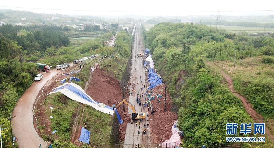 3月31日,工作人員在鐵軌上檢查。 3月30日,T179次列車途經(jīng)京廣鐵路湖南省郴州市永興縣高亭司鎮(zhèn)永華村路段時(shí),因附近山體滑坡,撞上塌方體,中斷行車。 事故發(fā)生后,多方力量在現(xiàn)場連夜緊張搶修,將脫軌側(cè)翻的列車車廂破拆清理出現(xiàn)場,對(duì)塌方山體進(jìn)行處理。目前在修復(fù)的鐵軌上,已有車輛在進(jìn)行運(yùn)行安全測試。