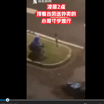 8月4日凌晨2點多,受臺風(fēng)“黑格比”影響,浙江玉環(huán)狂風(fēng)大作、風(fēng)雨交加。一位外賣小哥被拍到依然頂著臺風(fēng)送餐。外賣電動車被吹倒,餐盒散落一地,小哥抓住路旁的柱子才沒被吹跑。幾分鐘后,他終于艱難地站起來推著車子離開。
