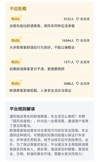 這方面,也有網(wǎng)友認(rèn)為,“順風(fēng)車就是方便你我,誰也避免不了碰到這種時(shí)候,能帶就帶一程”,“具體得看喝醉的程度,不能一概而論,如果乘客酒后行為不過分的話也可以考慮。”這些觀點(diǎn),充分體現(xiàn)出廣大用戶對(duì)與順風(fēng)車“互助”和“溫度”內(nèi)涵的認(rèn)同與踐行。