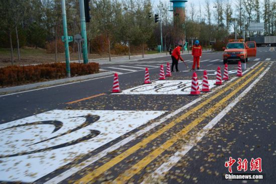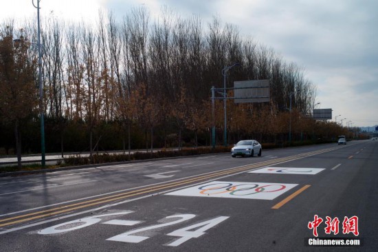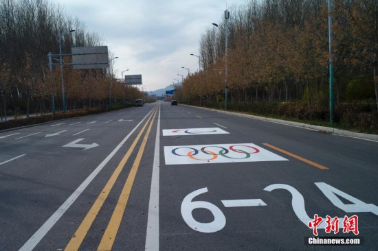 10月30日,北京延慶,道路上已施劃奧運(yùn)專用道標(biāo)識(shí)。近日,北京冬奧會(huì)延慶賽區(qū)各條主要干道,施工人員正在實(shí)施奧運(yùn)專用道標(biāo)志牌安裝收尾工作。