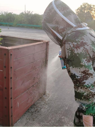 發(fā)現(xiàn)這一情況后,普濟管理所立即采取措施,值班人員小聶穿上防護服,手持殺蟲劑對防撞護欄、安全島、崗亭蜜蜂滯留區(qū)域進行噴曬,經(jīng)過近一小時的“除蜂大作戰(zhàn)”,蜜蜂被全部清除,消除了安全隱患,保障了現(xiàn)場安全暢通。