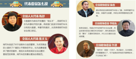 會(huì)議上,委員、代表們?yōu)槔习傩瞻l(fā)聲,提議網(wǎng)約車行業(yè)應(yīng)該更加有序、健康的發(fā)展,加強(qiáng)監(jiān)管。其中全國人大代表蔡繼明建議按照國務(wù)院公平競爭審查制度的要求,提高政策透明度,加強(qiáng)政企合作,提升監(jiān)管能力;上海代表團(tuán)代表樊蕓則建議相關(guān)文件需要得到堅(jiān)決貫徹執(zhí)行,使出租汽車行業(yè)回歸法制軌道,讓出租汽車行業(yè)從業(yè)人員的合法權(quán)益得以保障,進(jìn)一步維護(hù)廣大消費(fèi)者的權(quán)益,促進(jìn)網(wǎng)約車市場(chǎng)健康發(fā)展出行市場(chǎng)的健康發(fā)展。