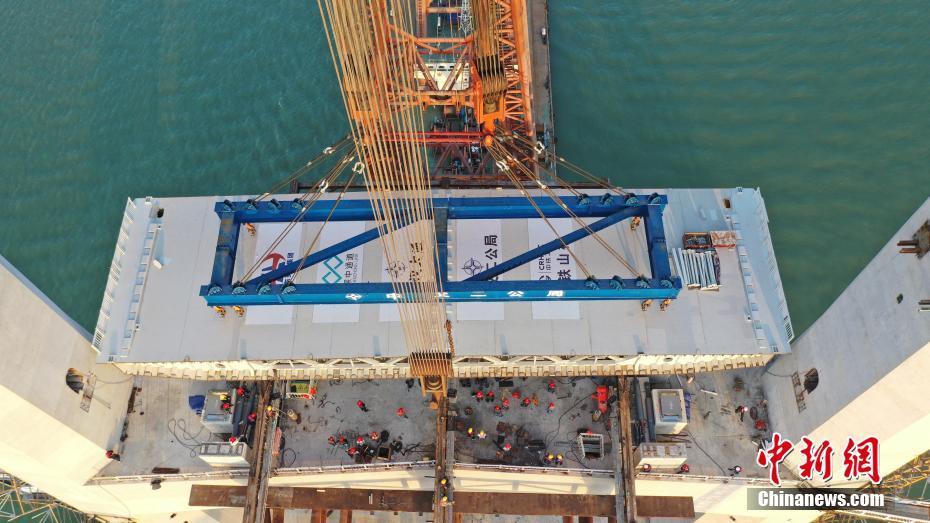 11月24日,廣東省中山市,粵港澳大灣區(qū)超級工程——深中通道中山大橋首片重達(dá)490噸的鋼箱梁完成安裝,標(biāo)志著中山大橋主橋上部構(gòu)造施工駛?cè)肟燔嚨。?jù)介紹,此次架設(shè)的鋼箱梁梁高4米,長12.4米,寬43.5米,相當(dāng)于1.3個(gè)國際籃球場的面積。圖為深中通道現(xiàn)場正在進(jìn)行中山大橋首片梁架設(shè)作業(yè)。(無人機(jī)照片) 中新社發(fā) 廣東省交通集團(tuán) 供圖